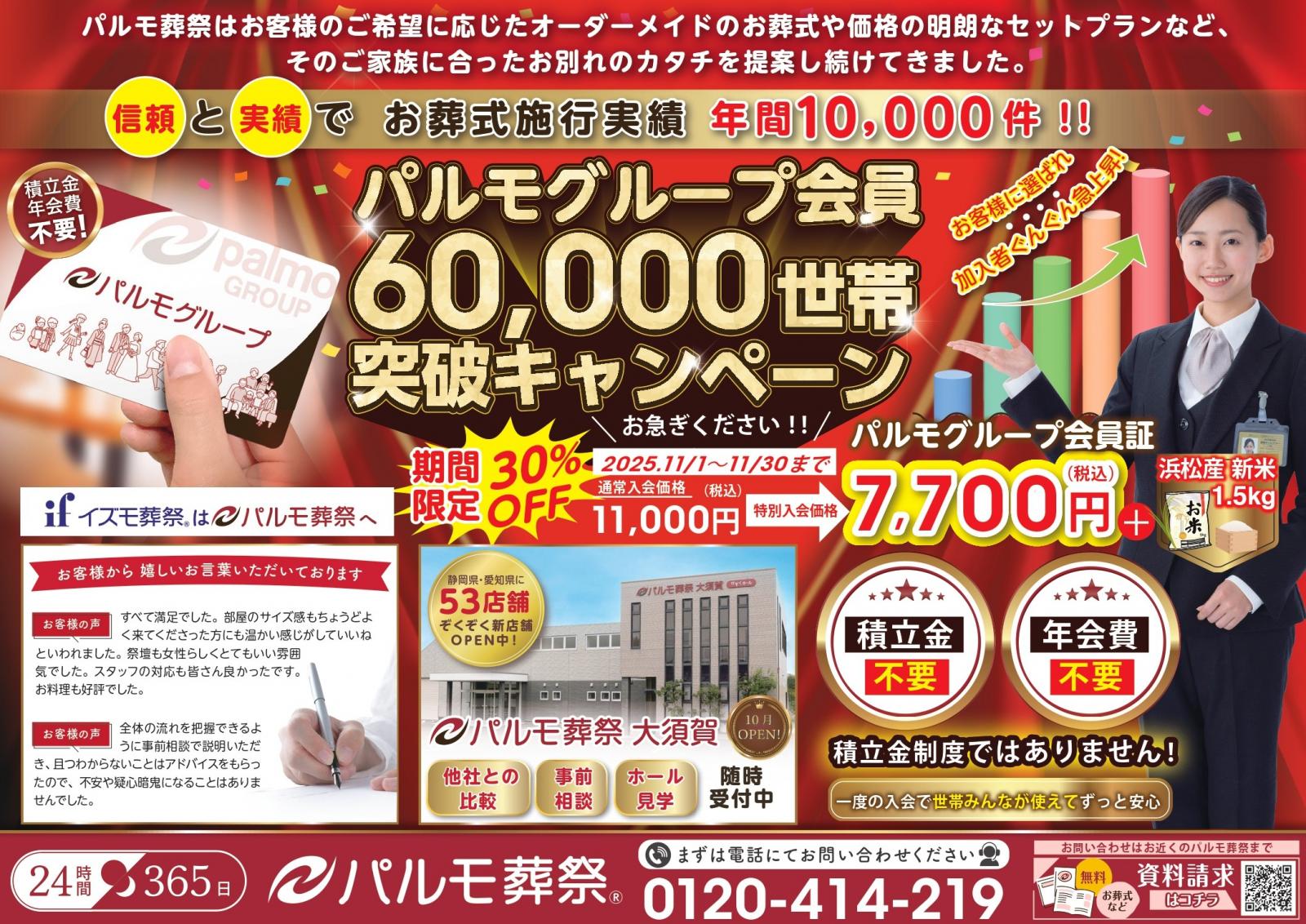 現在、パルモ葬祭では、パルモグループ会員様 60000世帯突破キャンペーン