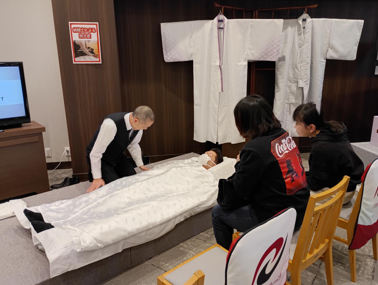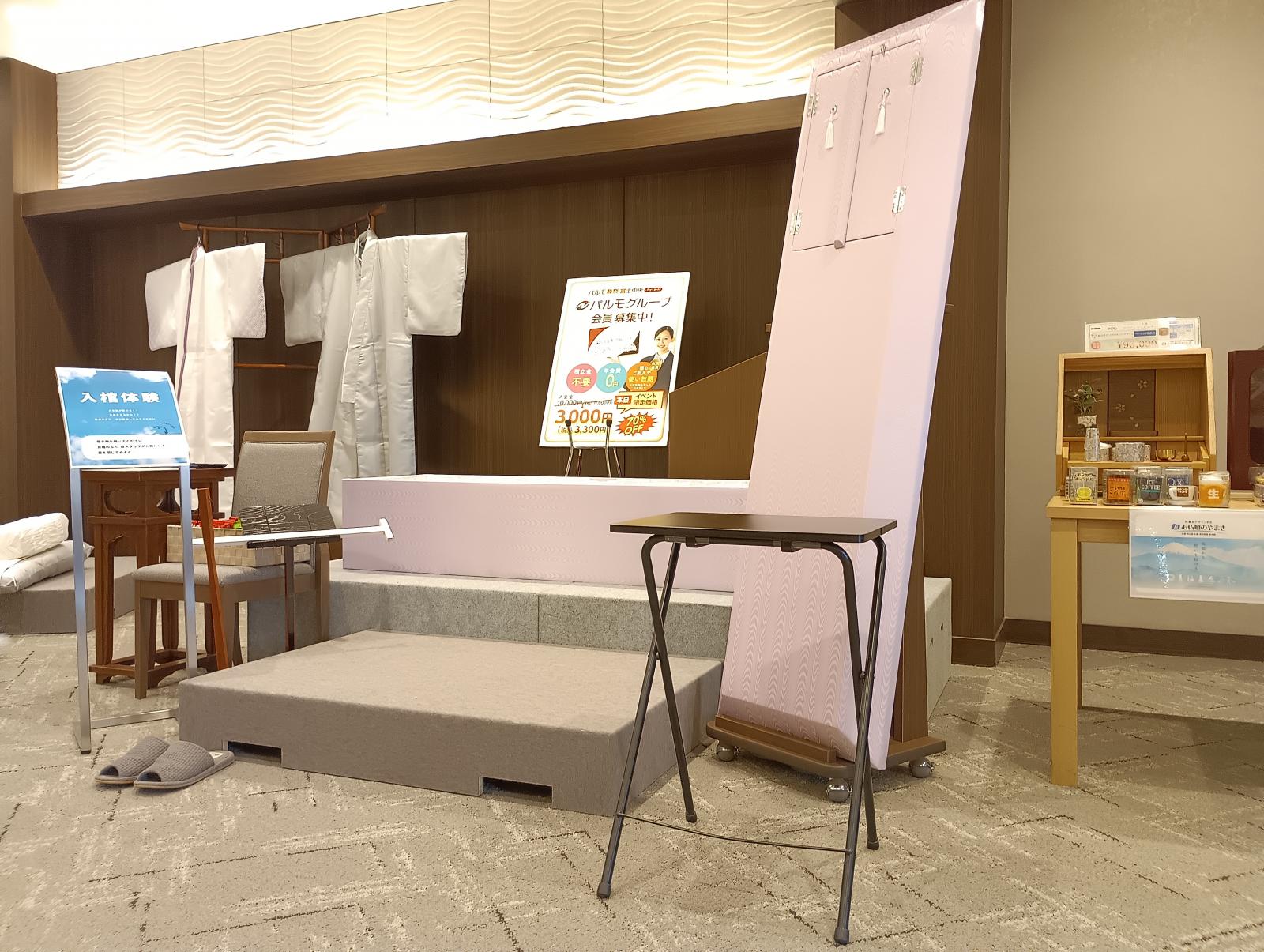 「入棺体験」では、実際に御棺に入ってみることができ、