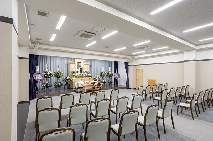 国道150号線から少し北に入った場所にあるパルモ葬祭大須賀は静かな雰囲気が特徴です。広々とした式場を完備し、故人様との最後の時間をゆっくりお過ごしいただけます。会食室や充分な駐車スペースもございますので、ご友人やお仕事関係の方まで広く参列いただくご葬儀にも安心の会場です。